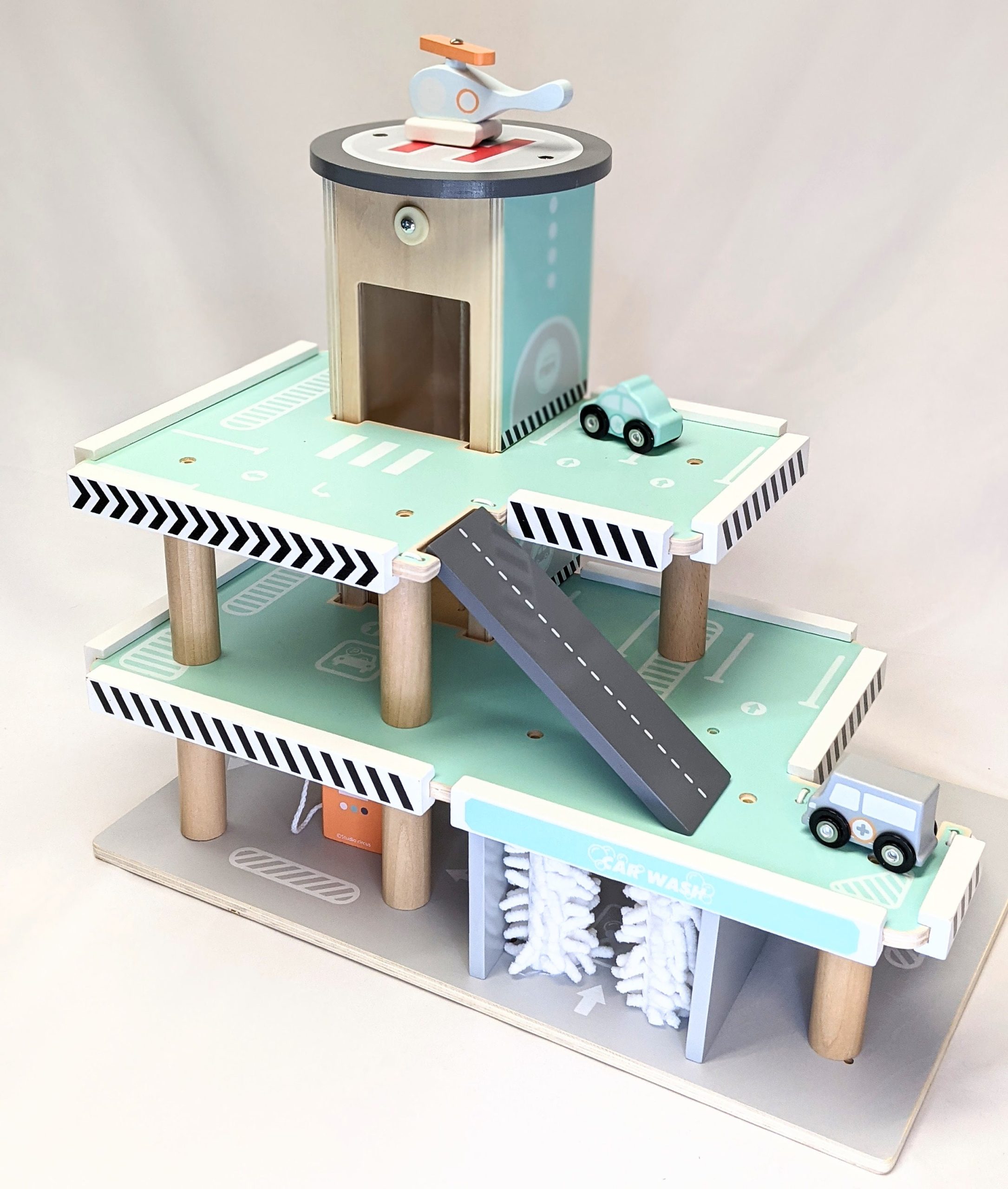 It features 3 levels with ramps, a car lift with a winding mechanism, helipad, petrol pump and a car wash with two fabric rollers. Included with the garage are 3 pastel coloured vehicles, a helicopter, a police car and an ambulance.