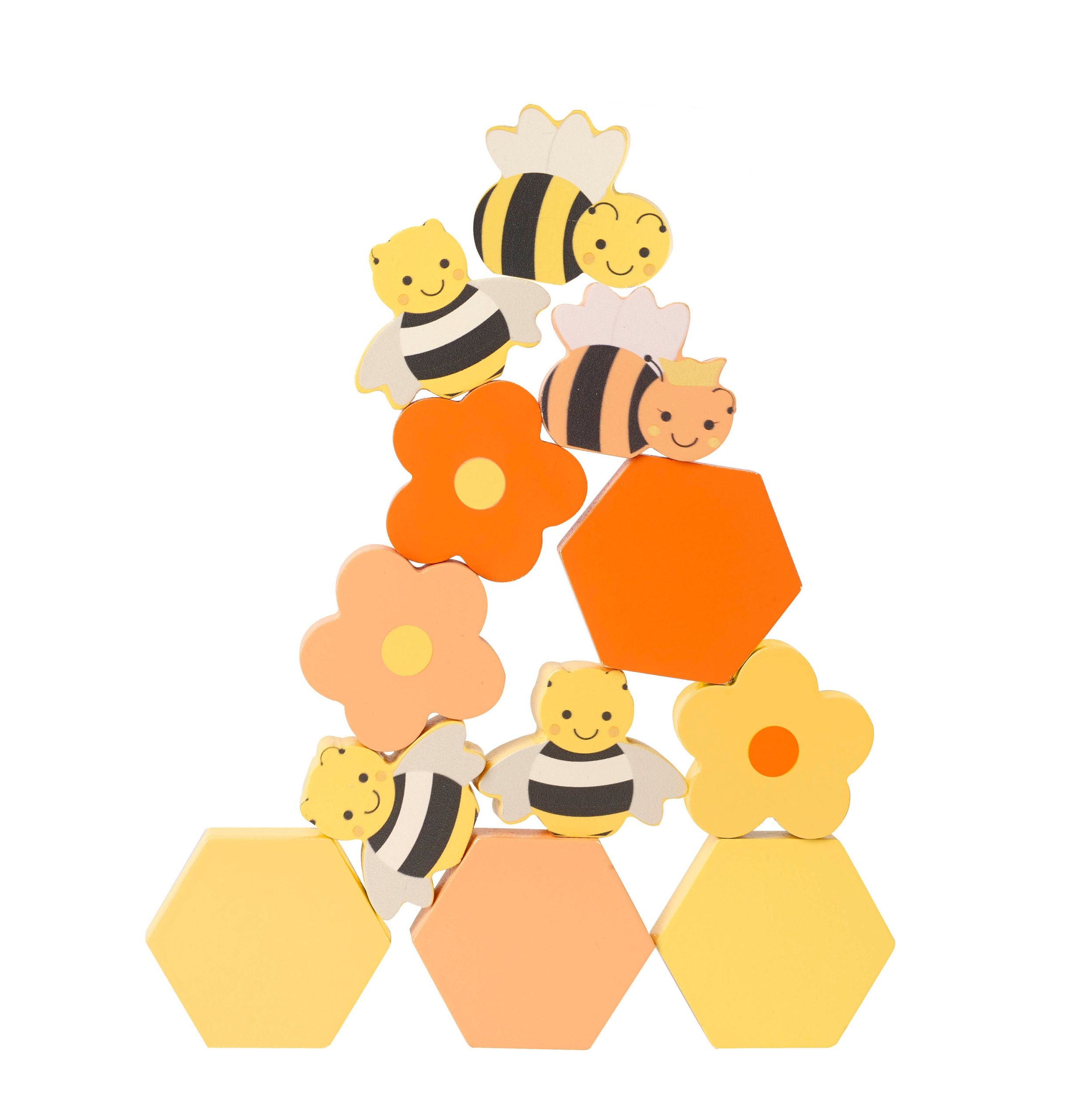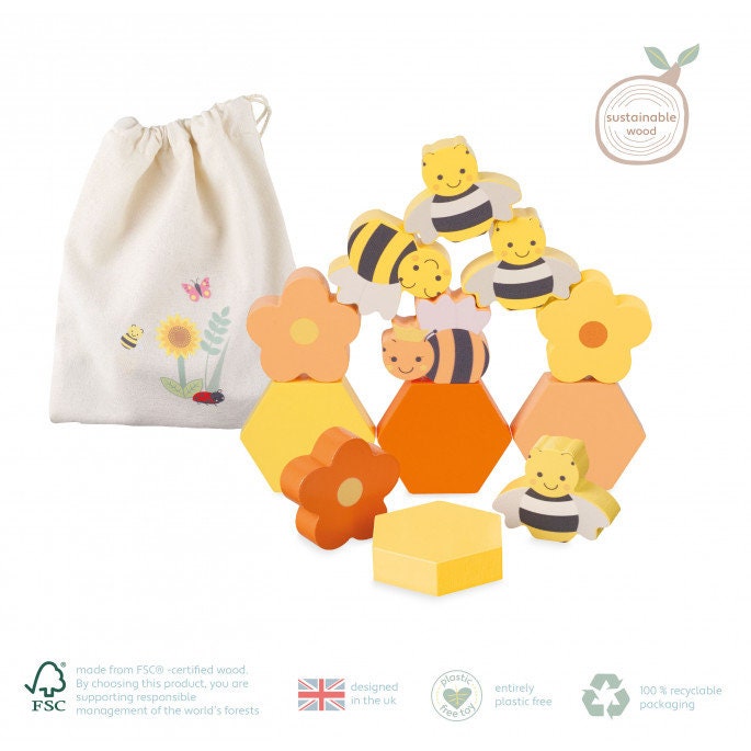 Our wooden honey bee set contains 12 pieces to stack and balance!