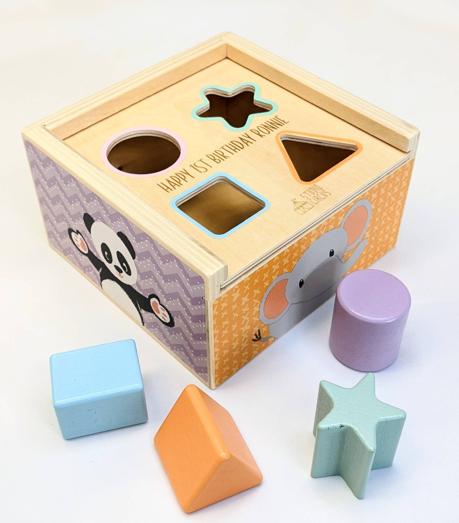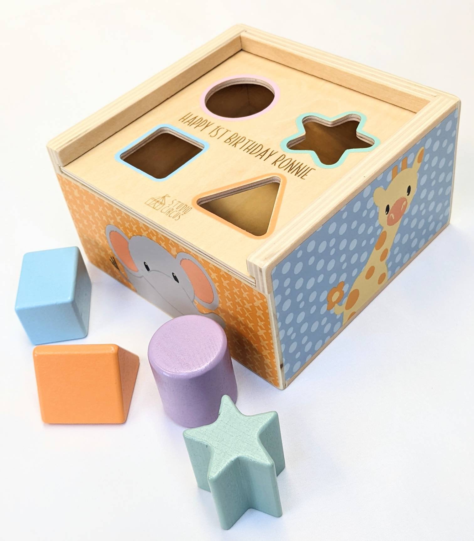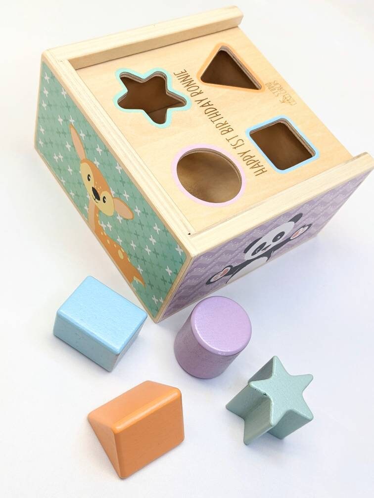 This beautifully designed and pastel coloured shape sorter is great for younger children. It has 4 wooden shape pieces to post through the shape sorter lid, which makes a great problem solving game!